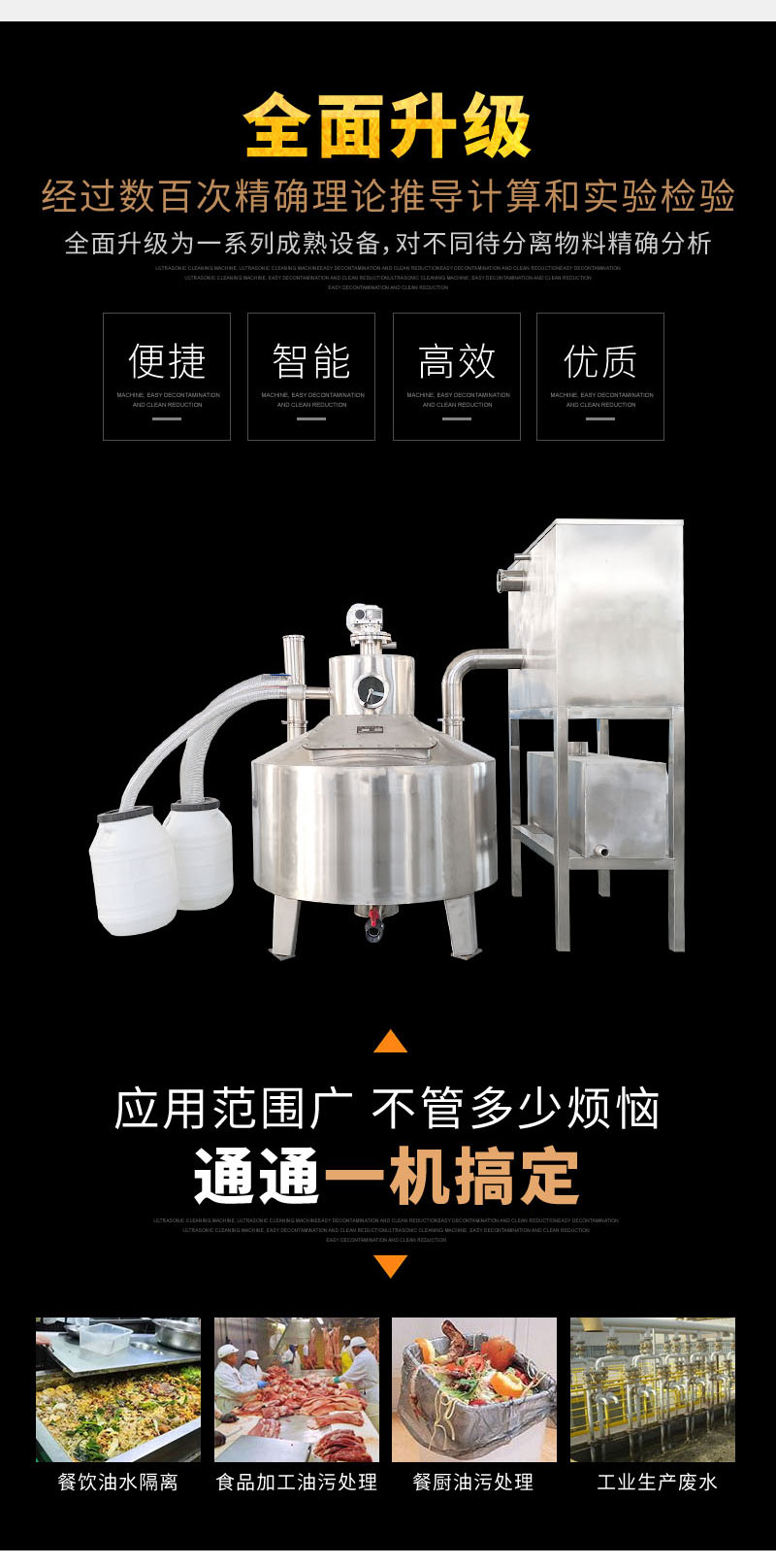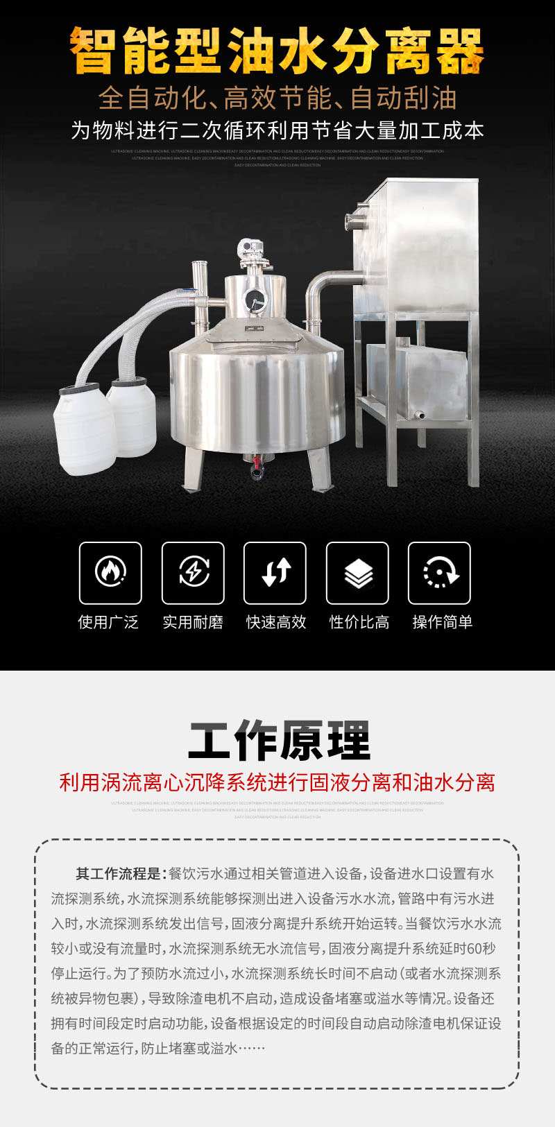 餐飲油水分離器,采用比重分離法+渦流沉降法雙重分離方法,對(duì)油水進(jìn)行分離,油水分離速度快、分油效果佳,該設(shè)備具有自動(dòng)啟停、自動(dòng)出渣、自動(dòng)加溫、自動(dòng)/手動(dòng)排油、自動(dòng)排水、故障自動(dòng)報(bào)警等多項(xiàng)功能,低耗能,高產(chǎn)出,模塊化設(shè)計(jì),安裝便捷,并可根據(jù)用戶現(xiàn)場(chǎng)空間,量身定制,適應(yīng)于大小不同場(chǎng)所。